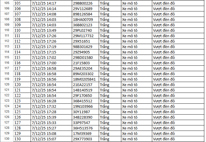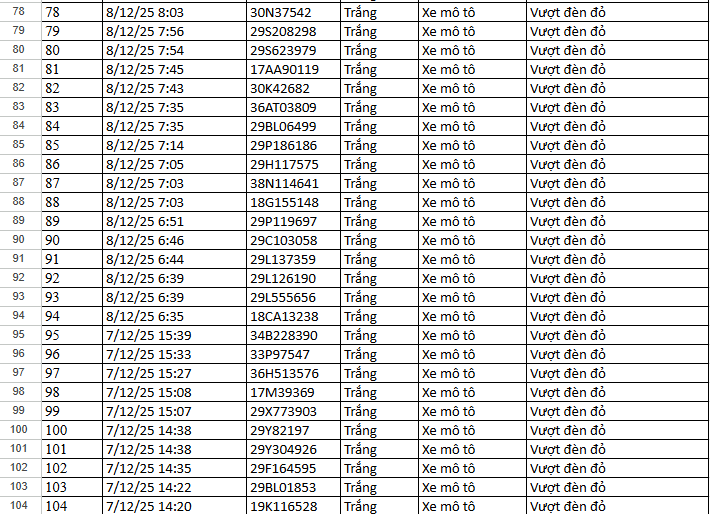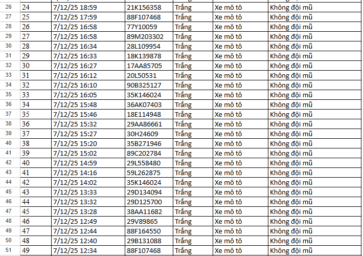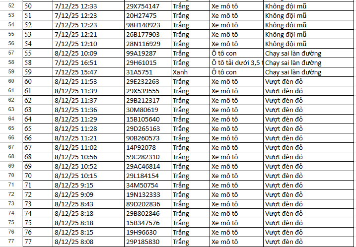 Danh sách ô tô, xe máy bị camera AI phát hiện vi phạm từ 12h ngày 7/12 đến 12h ngày 8/12: