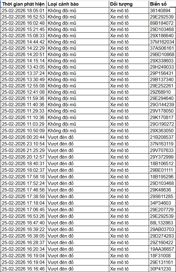 Cục Cảnh sát giao thông thông báo, từ 7h30’ ngày 25/2/2026 đến 7h30’ ngày 26/2/2026, qua trích xuất dữ liệu từ camera A.I được thí điểm lắp đặt tại nội đô Hà Nội (nút giao phố Phạm Văn Bạch - Hoàng Quán Chi), đã tự động phát hiện: 29 trường hợp không đội mũ bảo hiểm và 65 trường hợp không chấp hành hiệu lệnh của đèn tín hiệu - vượt đèn đỏ (mô tô, xe gắn máy). Danh sách cụ thể như sau: