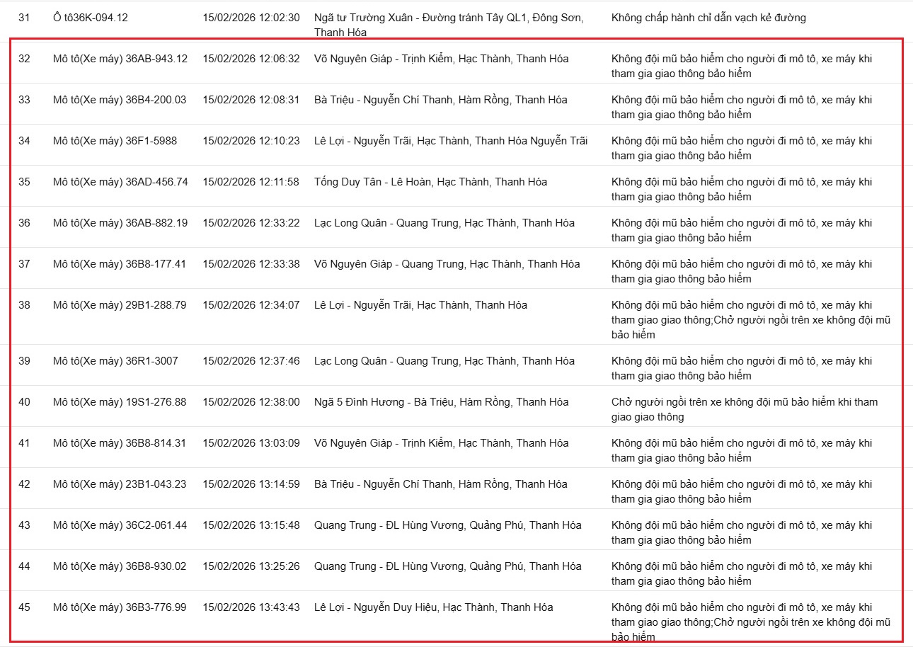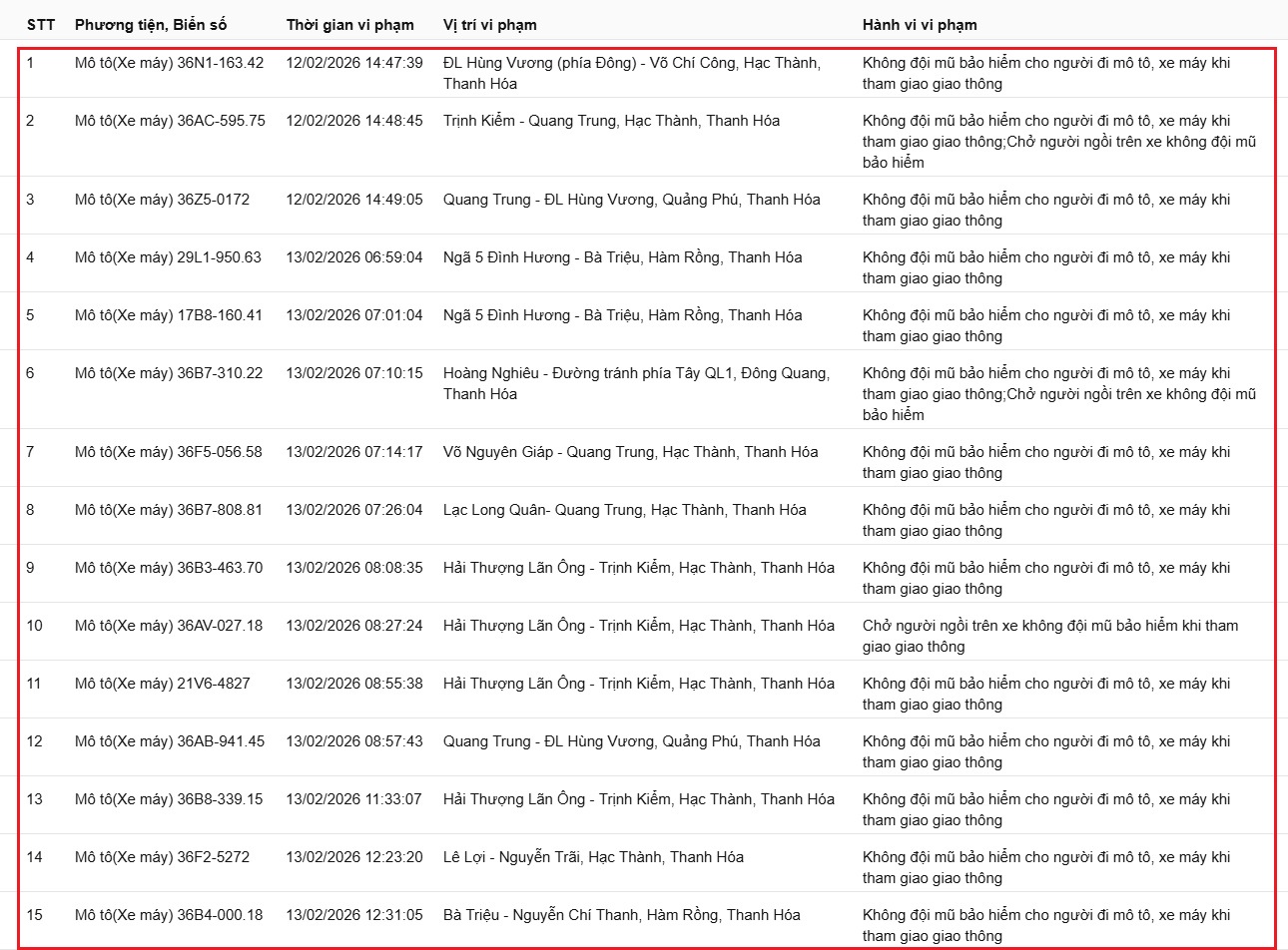 Công an tỉnh Thanh Hóa thông báo, từ ngày 12/2/2026 đến ngày 15/2/2026, thông qua thiết bị kỹ thuật nghiệp vụ, các tổ công tác của phòng CSGT đã phát hiện, ghi nhận bằng hình ảnh tổng cộng 49 trường hợp mô tô-xe máy không chấp hành đúng các quy định về TTATGT đường bộ. Danh sách biển số vi phạm cụ thể như sau: