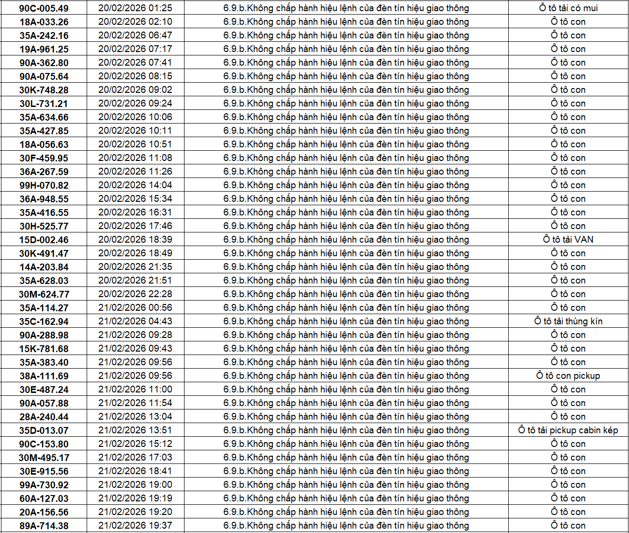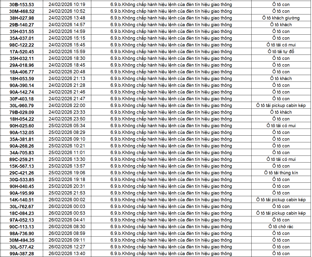 Theo thông báo của Phòng Cảnh sát giao thông Công an tỉnh Ninh Bình, từ ngày 18/2/2026 đến 28/2/2026 đã phát hiện 434 trường hợp phương tiện vi phạm trật tự an toàn giao thông qua hệ thống camera giám sát giao thông và phương tiện thiết bị kỹ thuật nghiệp vụ. Trong đó, lỗi vi phạm phổ biến nhất là không chấp hành hiệu lệnh của đèn tín hiệu giao thông với 186 trường hợp. Danh sách cụ thể như sau: