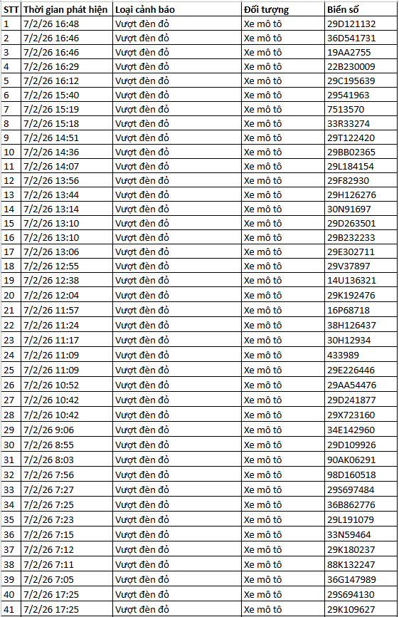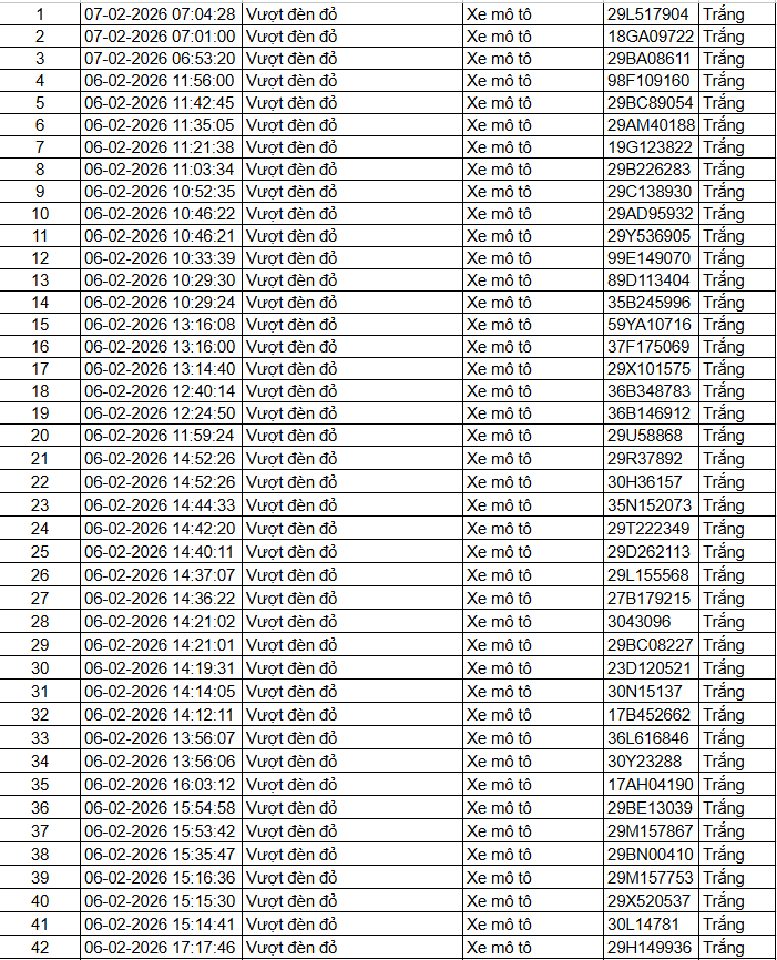 Ngoài ra, Cục Cảnh sát giao thông thông báo, qua trích xuất dữ liệu từ camera A.I được thí điểm lắp đặt tại nội đô Hà Nội, trong 2 ngày cuối tuần 7/2 và 8/2 đã tự động phát hiện: 135 xe máy vi phạm TTATGT tại TP. Hà Nội . Danh sách cụ thể như sau: