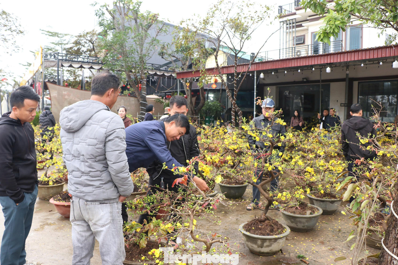 Ngày 9/2, đoạn đường Nguyễn Xí, xã Đông Lộc (tỉnh Nghệ An) bỗng nhộn nhịp khác thường. Trước cửa một ngôi nhà dân, hơn trăm chậu mai vàng xếp thành hàng dài, người ra kẻ vào xem cây, hỏi giá, chốt mua rôm rả.