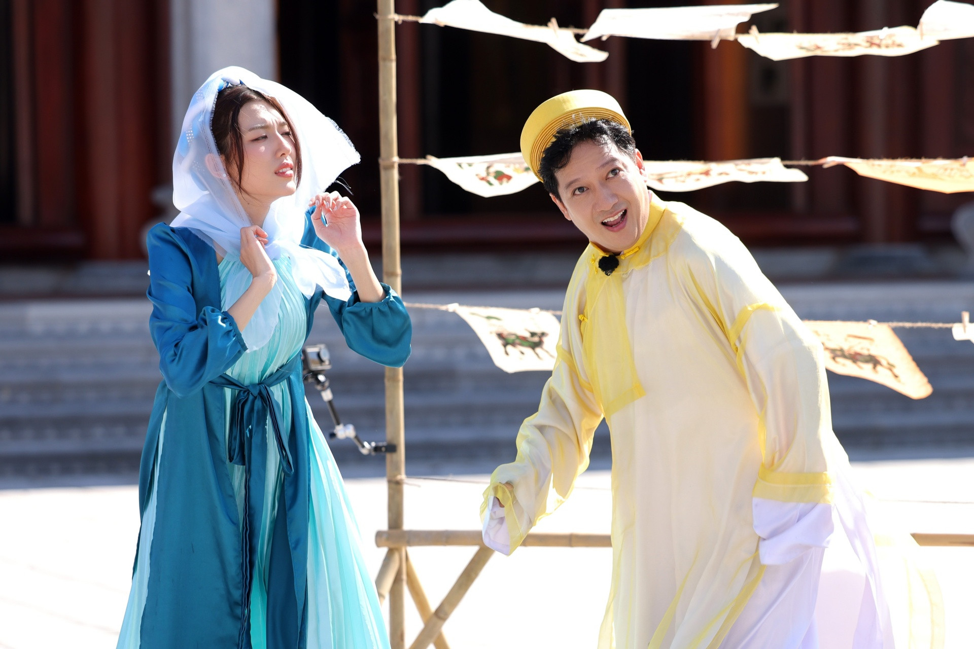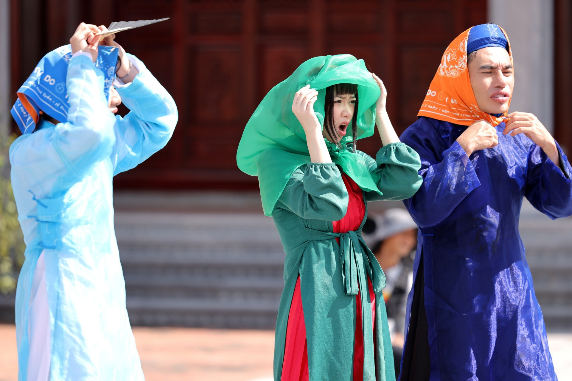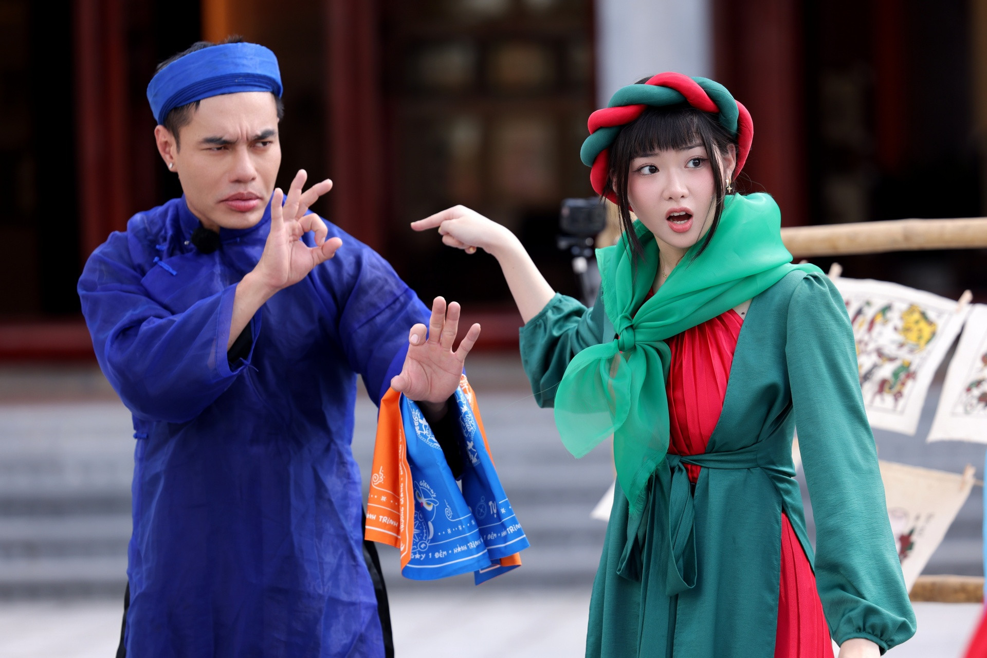 Chọn được chiếc áo lam, Lê Dương Bảo Lâm liền nhập vai, diễn tiểu phẩm “Lan và Điệp” với sự hỗ trợ của Kiều Minh Tuấn. HIEUTHUHAI gây cười khi mặc trang phục bảo vệ.