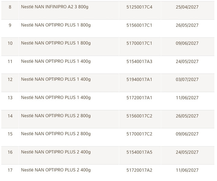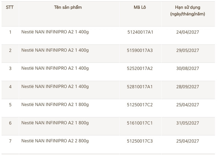 Danh sách 17 lô sữa NAN vừa được Nestlé Việt Nam thu hồi