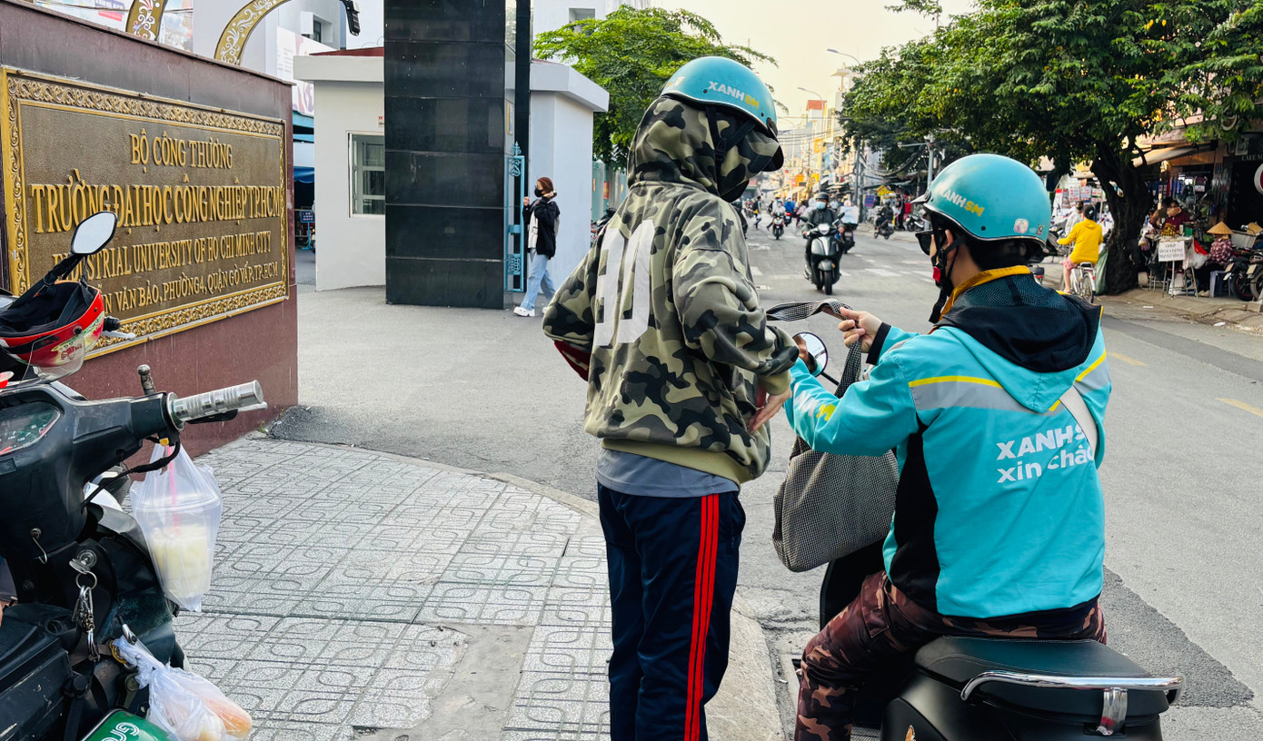 Hình ảnh sinh viên đi học bằng xe ôm công nghệ.