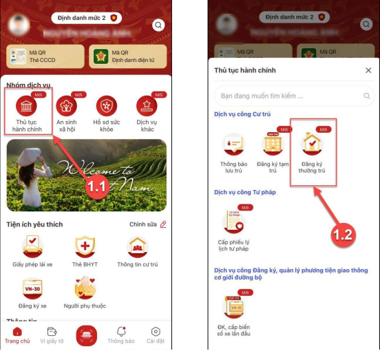 Điền các trường có dấu chấm đỏ (bắt buộc): họ tên, ngày sinh, số định danh cá nhân, số điện thoại…