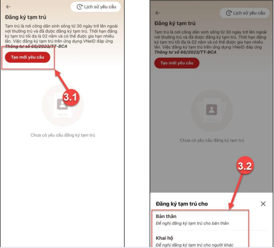 - Ở màn hình Đăng ký tạm trú, bấm “Tạo mới yêu cầu”.