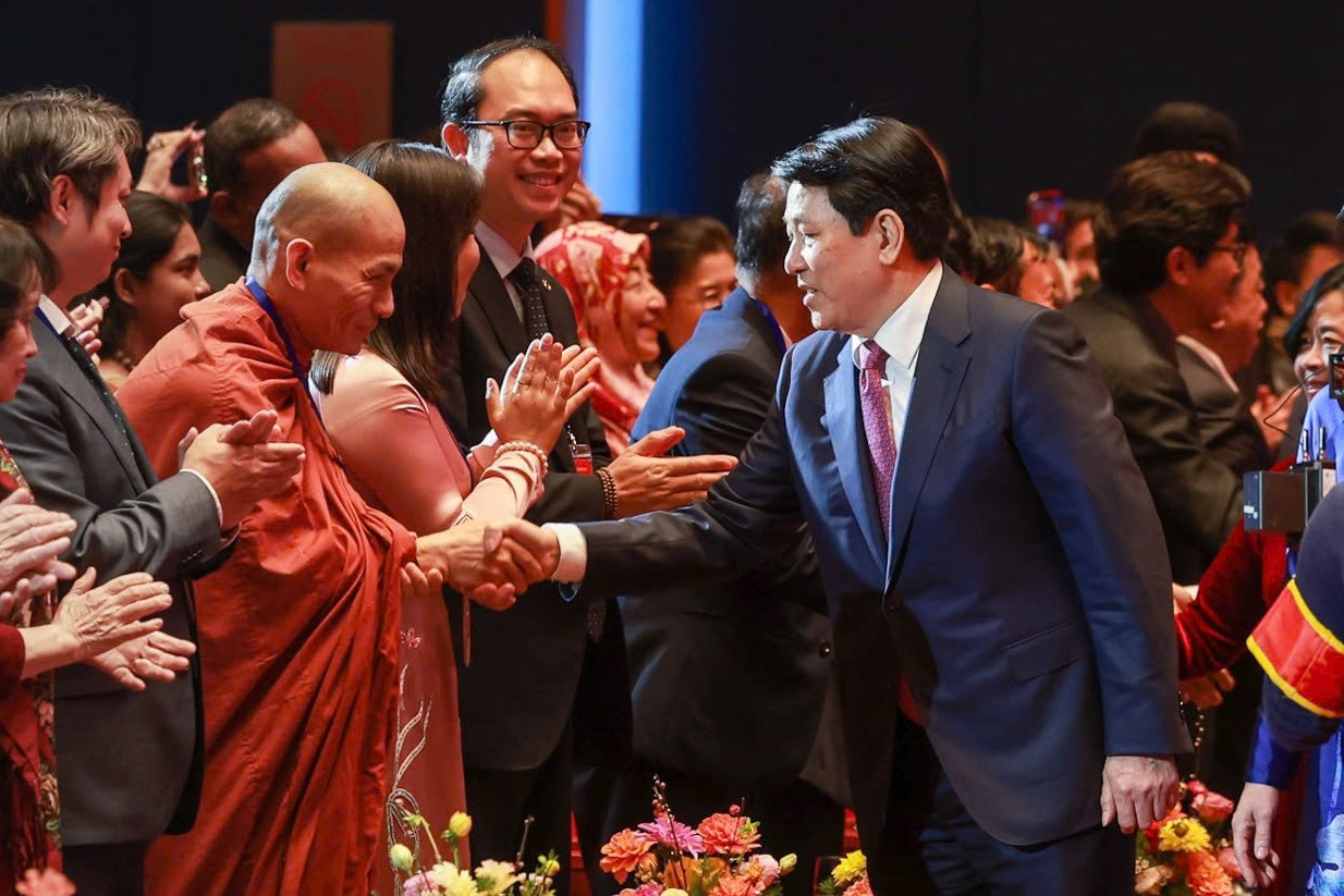 Và rồi khoảnh khắc khiến cả khán phòng lặng đi khi 23 chiếc khăn đũi thủ công của Desilk được nâng niu trao tặng cho 23 kiều bào tiêu biểu nơi hàng ghế khán giả. Không chỉ là món quà, đó là một lời chào của quê hương. Mỗi sợi đũi thô mộc mang theo hơi thở của làng nghề, mỗi nếp gấp là một câu chuyện văn hóa, một nhịp nối giữa quá khứ và hiện tại.