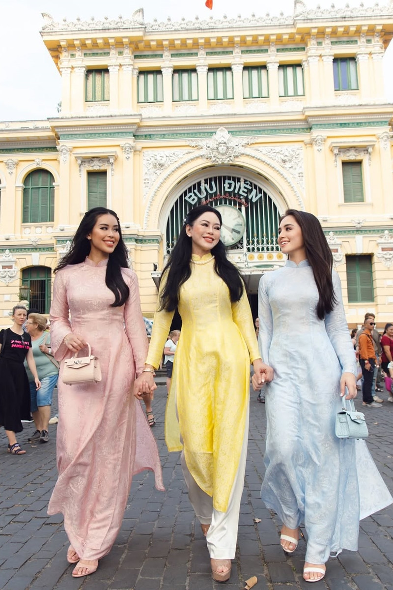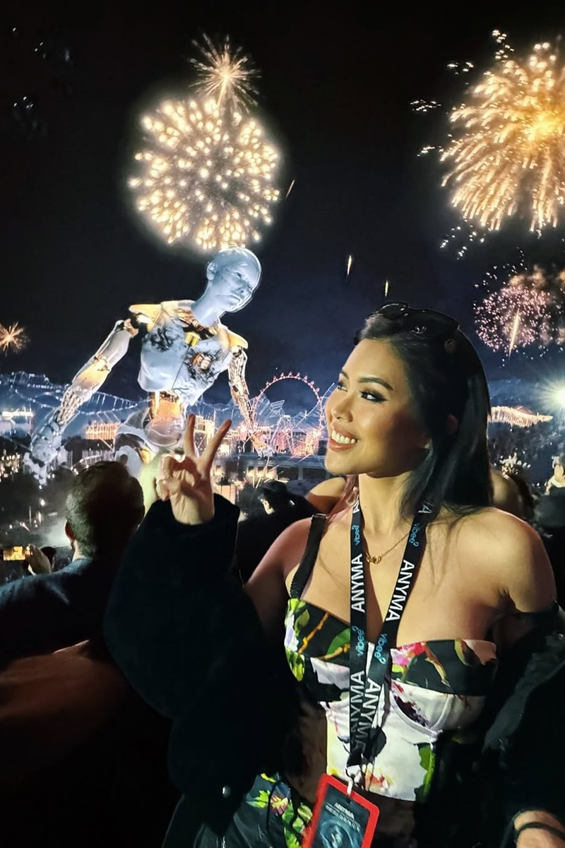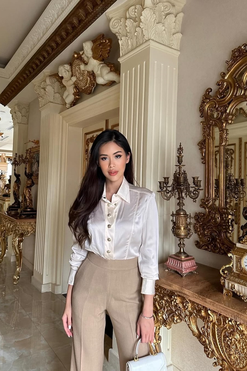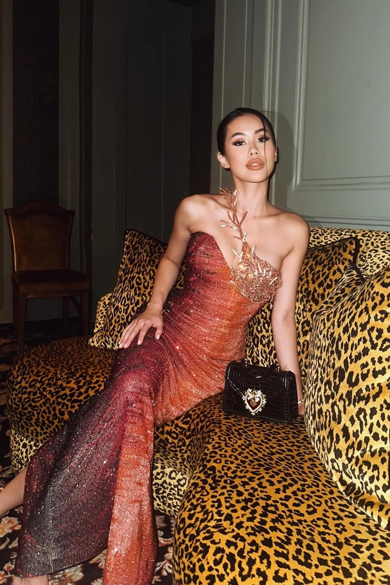 Những chuyến du lịch xa hoa cũng là dịp để Tiên Nguyễn khoe gu thời trang tinh tế. Tại Milan, cô tạo dáng bên Nhà thờ Duomo với áo ba lỗ đen, váy da đen và boots chunky, kết hợp túi MCM nâu. Ở Rome, cô chọn váy lụa đồng ánh kim có chi tiết dây thắt eo phức tạp, kết hợp túi Dolce&Gabbana mini đính pha lê.