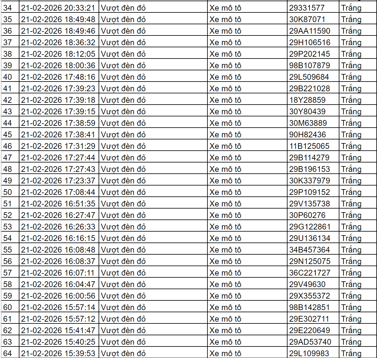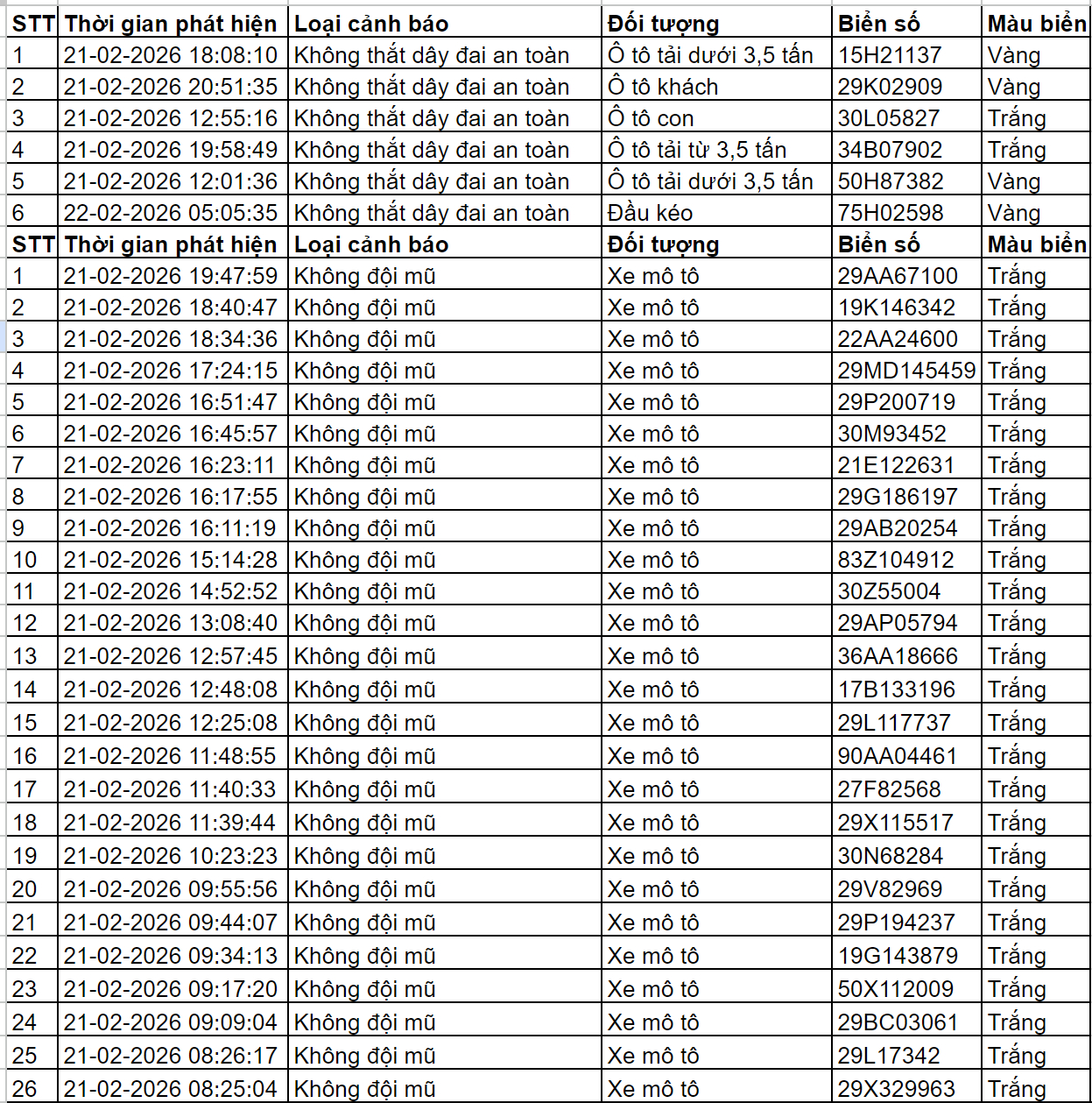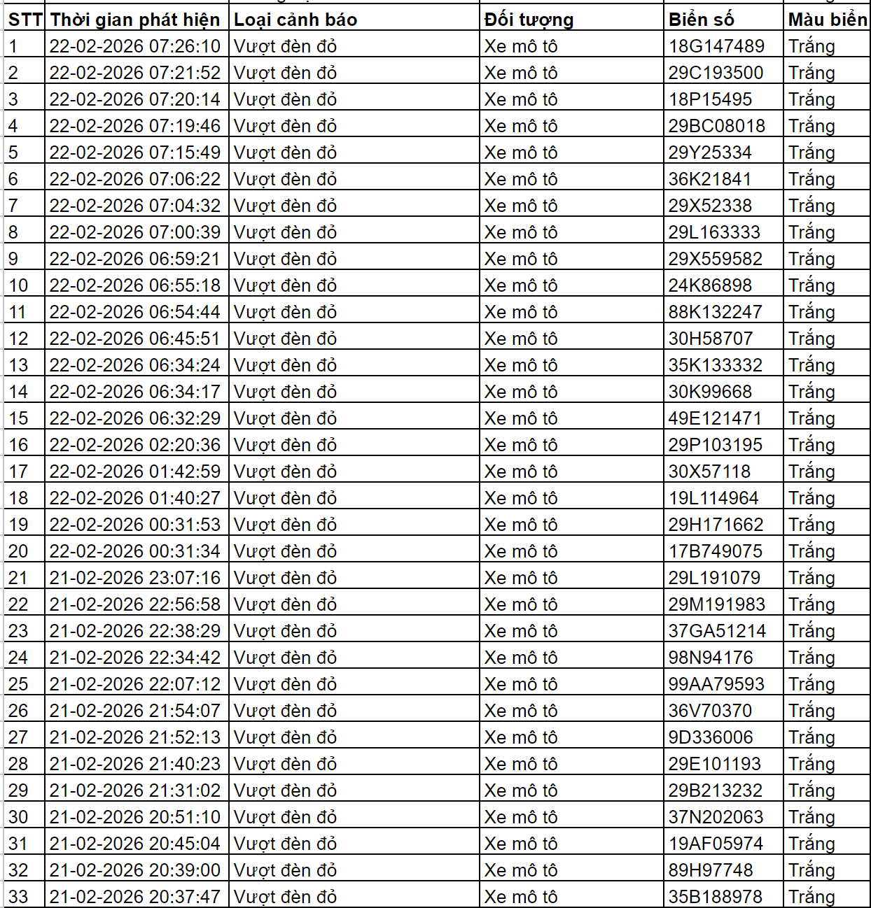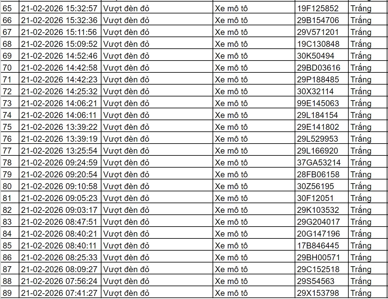 Cục Cảnh sát giao thông thông báo, từ 12h00’ ngày 21/2/2026 đến 12h00’ ngày 22/2/2026, Camera A.I tại km 20 tuyến cao tốc Nội Bài -Lào Cai ghi nhận có 30.747 phương tiện đi qua với tốc độ trung bình là 78 km/h; phát hiện: 06 trường hợp không thắt dây đai an toàn; 00 trường hợp vi phạm về tốc độ. Các trường hợp vi phạm này đều được thông tin tới chủ phương tiện để xử lý theo quy định.