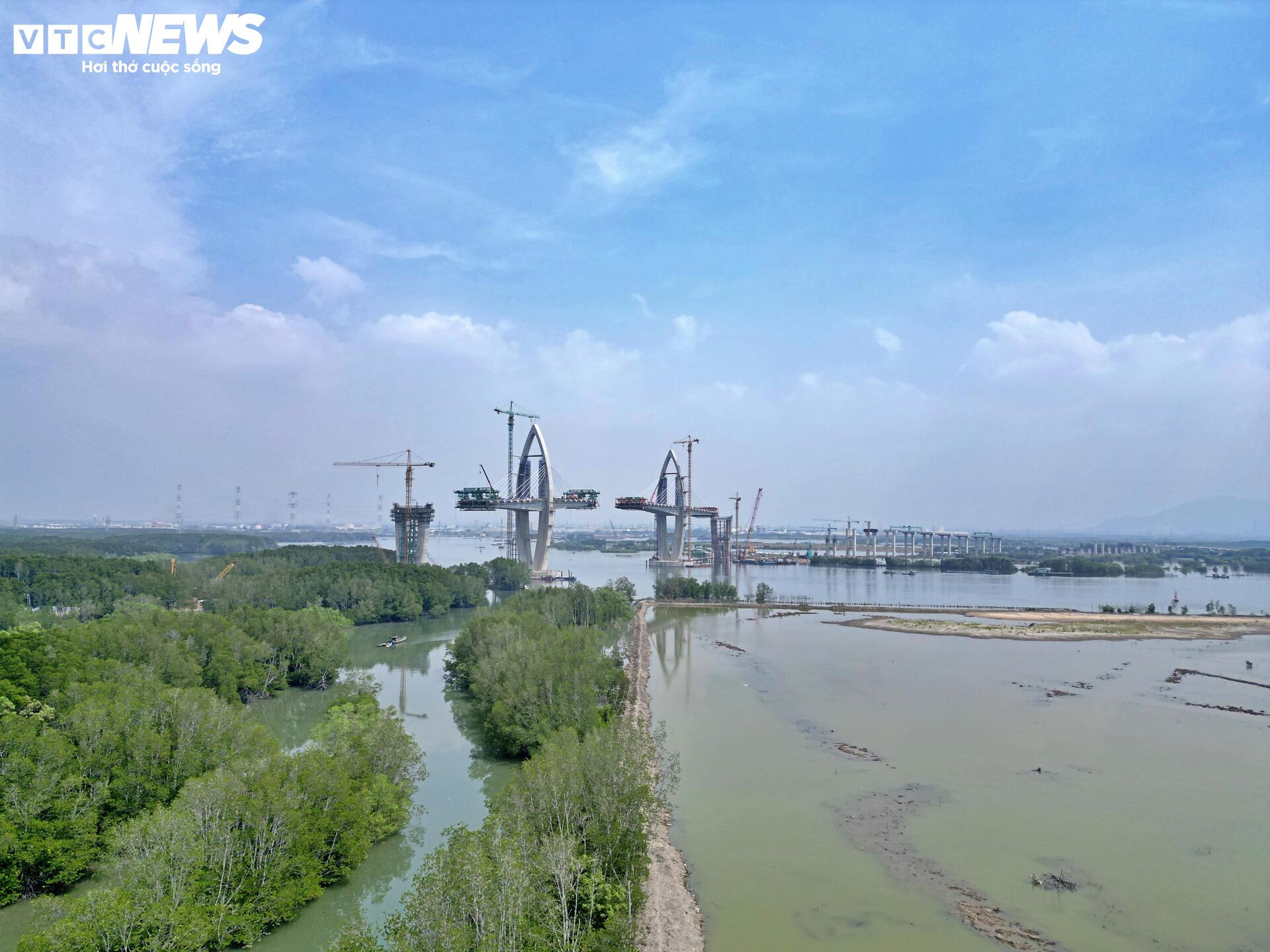Quan sát từ trên cao, loạt trụ cầu vươn mình giữa dòng nước, tạo nên bức tranh của một dự án giao thông quy mô lớn đang dần hoàn thiện.