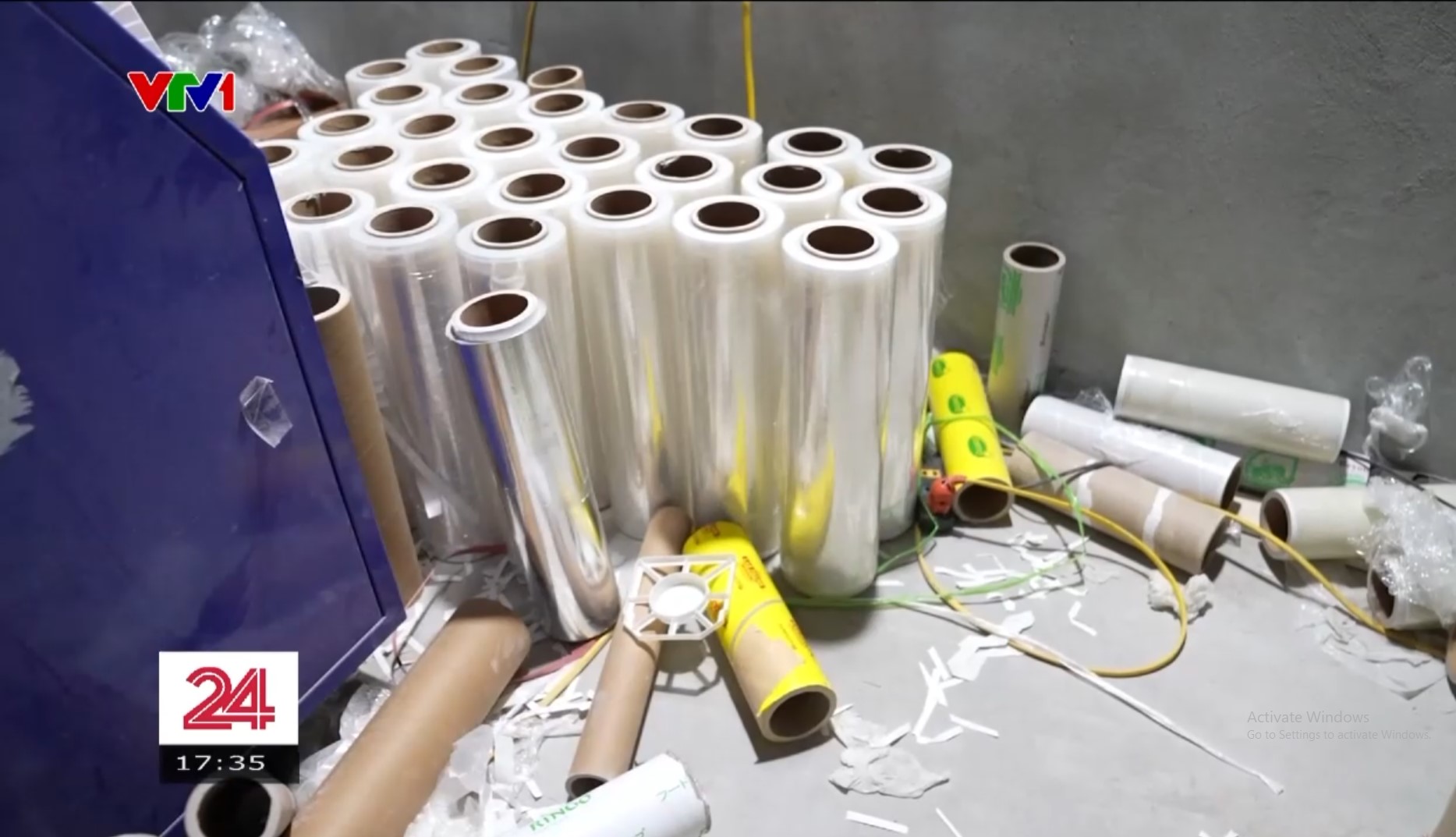 Bên trong nhà xưởng ẩm thấp, những cỗ máy cho ra lò hàng loạt màng bọc thực phẩm và màng nhôm giả mỗi ngày. Người này khai nhận, trước khi bắt tay vào làm, các đối tượng đã khảo sát thị trường, mua mẫu hàng thật của doanh nghiệp đã được bảo hộ nhãn hiệu về nghiên cứu rồi tiến hành làm giả.
