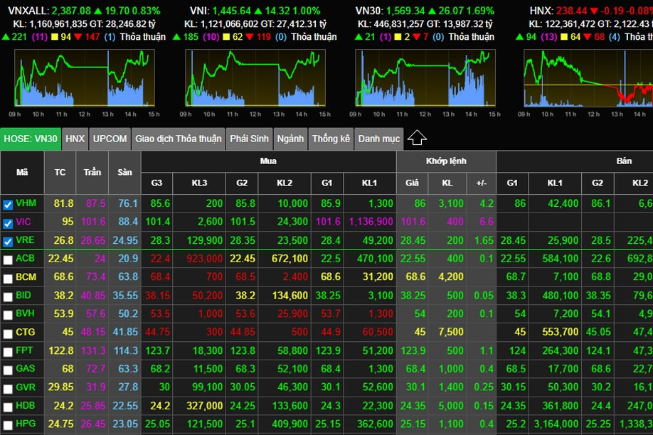 Cổ phiếu Vinhomes (VHM) tăng 1.500 đồng lên 99.500 đồng/cp. Vincom Retail (VRE) tăng 400 đồng lên 29.400 đồng/cp.